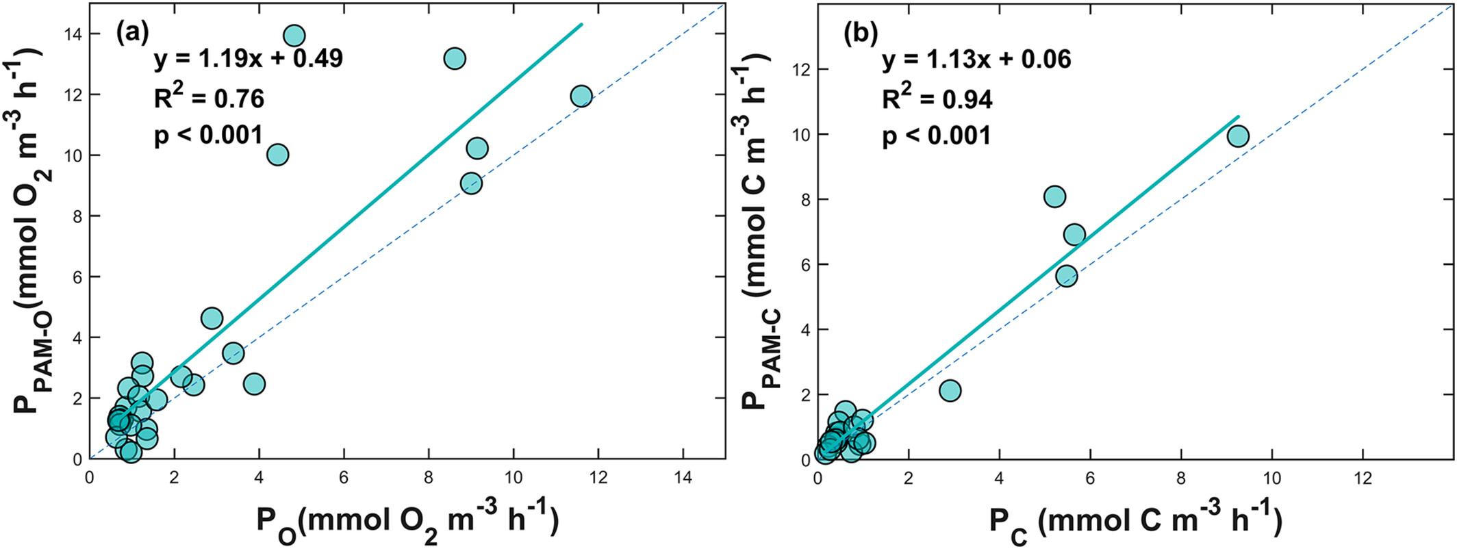 图2. 基于PAM估算的初级生产力与黑白瓶氧释放速率(a)和固碳速率(b)的关系