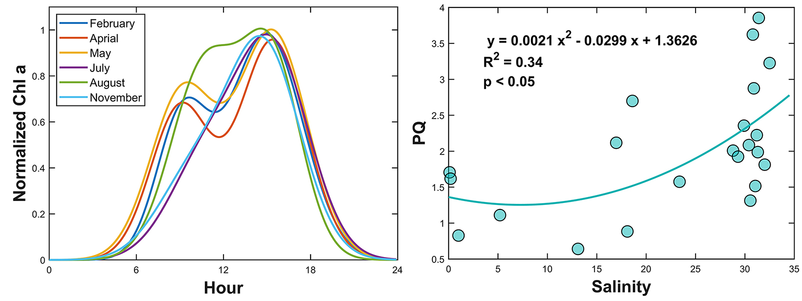 图1.(a)不同月份叶绿素周日变化;(b)光合熵(PQ)与盐度的关系