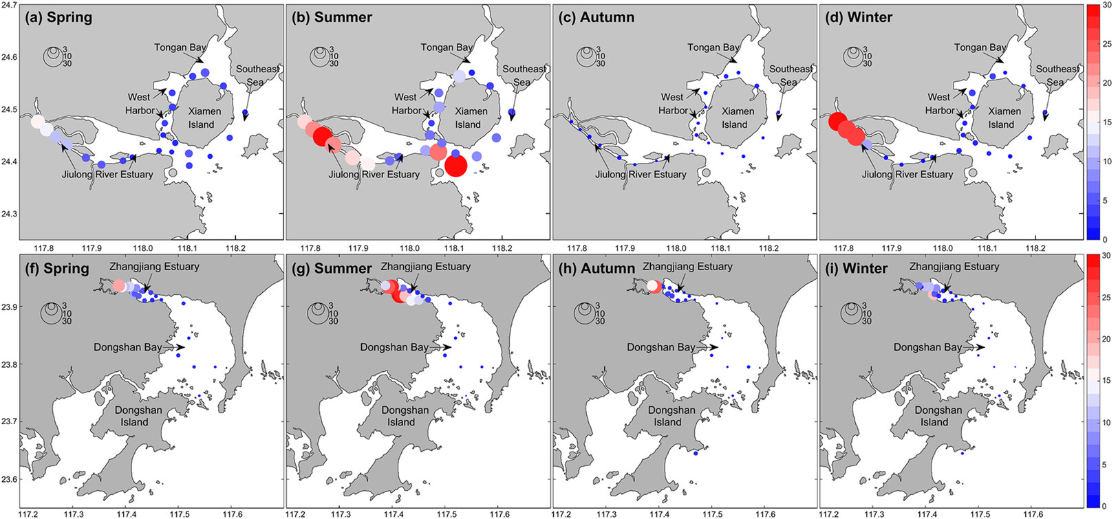 研究揭示了九龙江口-厦门湾、漳江口-东山湾等区域的表层初级生产力时空动态(图3)。表层初级生产力自河口上游向下游海湾逐渐降低,但在九龙江口中游最大浑浊带附近,常形成最低值区域。夏季初级生产力最高,春季次之,秋冬季节的初级生产力较低。结合表层PAM测量数据、真光层深度和水域面积,进一步估算了各个区域的年固碳通量,其中九龙江口、厦门湾、漳江口和东山湾分别约为2078 t C a-1、9813 t C a-1、225 t C a-1和1059 t C a-1。
